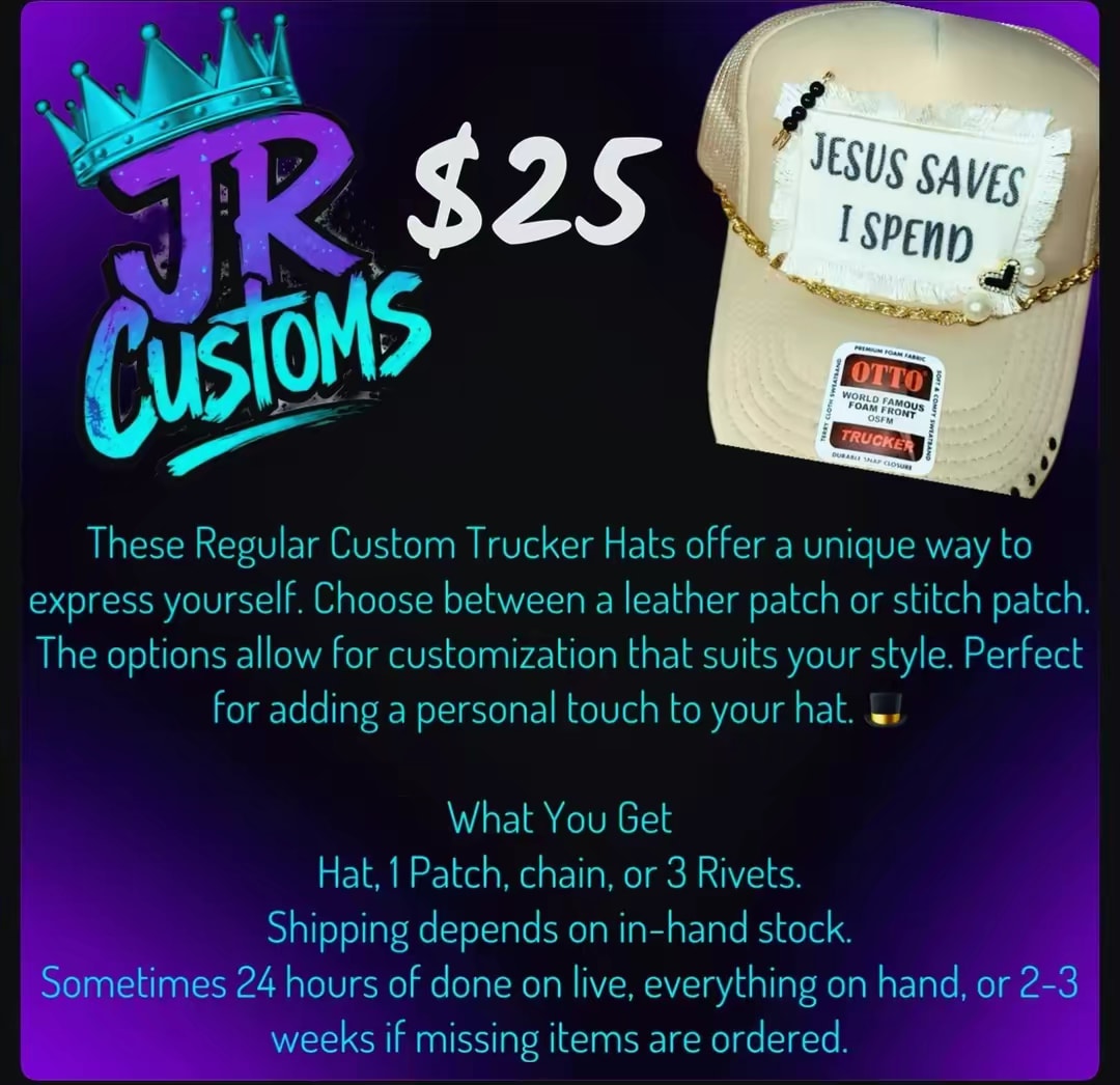 Express yourself with style custom trucker hat! Many different styles, colors and prints. Come join us and get your hat build custom on live on TikTok @Mrs JR Customs . Shipping added $7.95