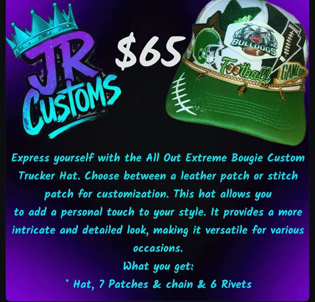 All Out Extreme Bougie Custom Trucker Hat! Express yourself come get your custom, all extreme bougie hat, and let’s build it on live on TikTok. Come see me @Mrs JR Customs FREE SHIPPING