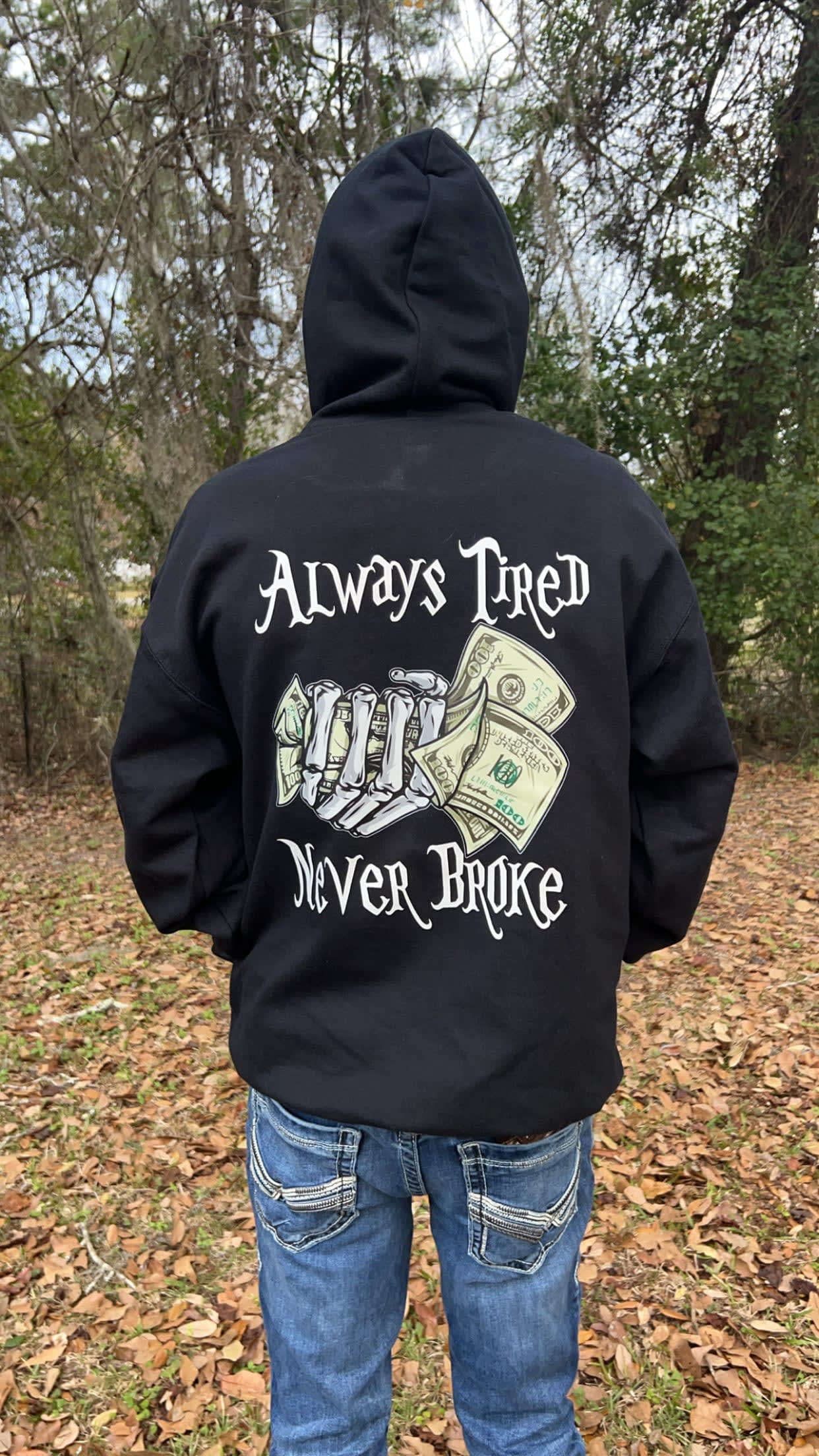 Always Tired Never Broke Hoodie This is a Black Hoodie with DTF design. Hood can be Customized many different Colors for Hoodie and Writing as well! When order make sure to make it custom and remember make it your own!! Shipping included $9.95